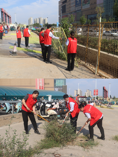 9月24日,新商城運(yùn)營公司黨支部組織開展“環(huán)境衛(wèi)生整治”主題黨日活動,弘揚(yáng)“奉獻(xiàn)、友愛、互助、進(jìn)步”的志愿精神。活動中,黨員志愿者身著紅馬甲,協(xié)作拆除商城外圍陳舊圍擋,清理地面雜草垃圾,并拿起水管,給周邊綠化帶中的植物澆水,草叢在灌溉下愈顯生機(jī)。